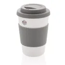 Das Ende der Einwegbecher! Nutzen Sie diesen wiederverwendbaren Kaffeebecher und leisten so Ihren Beitrag zum Umweltschutz. Langlebig und leicht, aus 100% recycelbarem PP und bis zu 100 Grad Celsius Food-Safe getestet. Deckel und Sleeve aus Silikon. Spülmaschinenfest und Mikrowellengeeignet. Ein Druck auf dem Becher wird einer Spülmaschinenwäsche jedoch nicht dauerhaft standhalten. Passt perfekt unter fast alle gängigen Kaffeemaschinen. Inhalt: 270ml