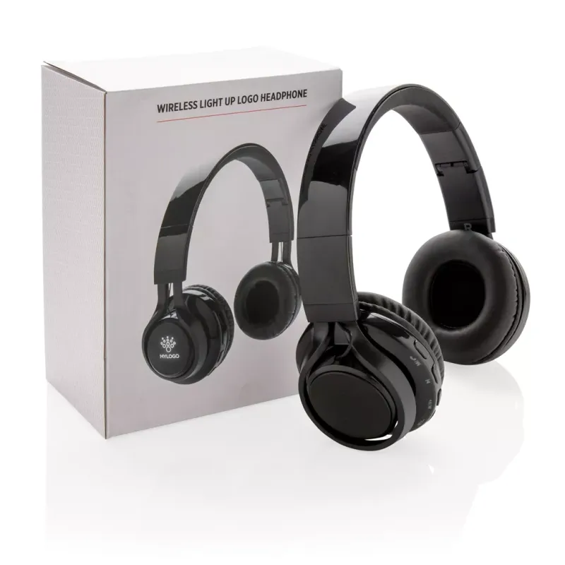 Diese wireless Kopfhörer können Sie individuell mit Ihrem gewünschten Logo auf der ABS Oberfläche veredeln. Das Logo wird bei Gebrauch erleuchtet und bietet somit die optimale Werbung für Ihre Marke! Die Kopfhörer verfügen über BT 4.2 mit einer Reichweite von bis zu 10 Metern. Die eingebaute 400mAh Batterie erlaubt es Ihnen bis zu 4 Stunden Musik hören und ist innerhalb 2 Stunden wieder aufgeladen. Die Kopfhörer verfügen über ein Mikrofon und eine Pick-up Funktion zur Annahme von Anrufen. Inkl. AUX-Kabel