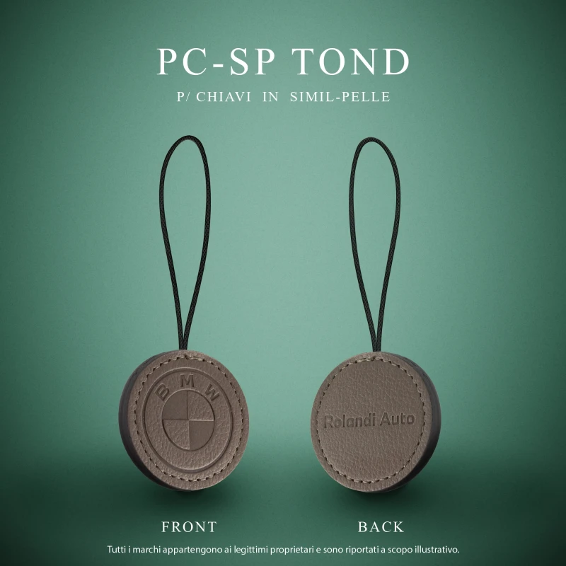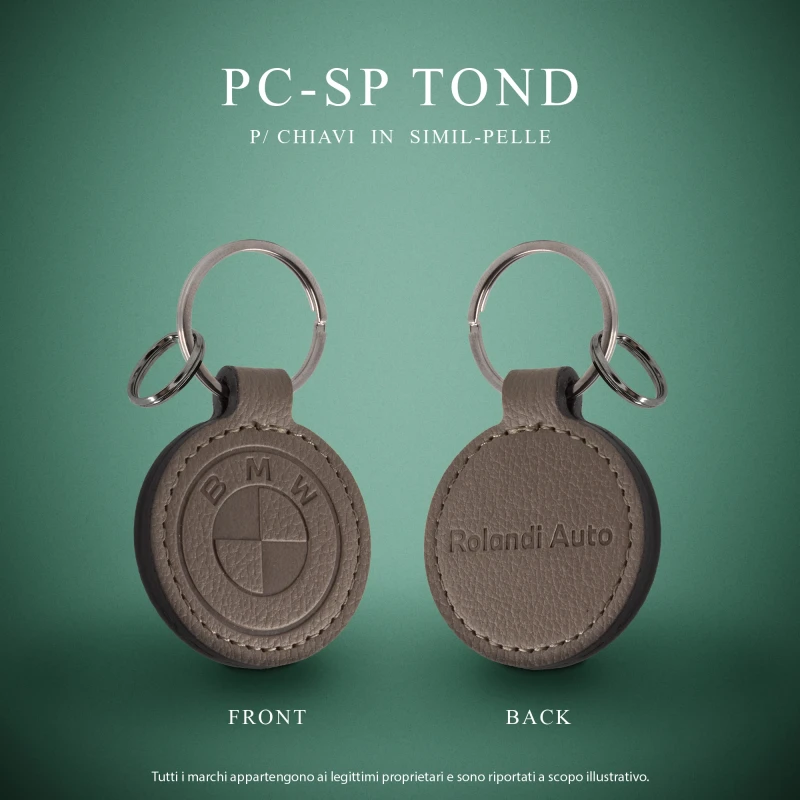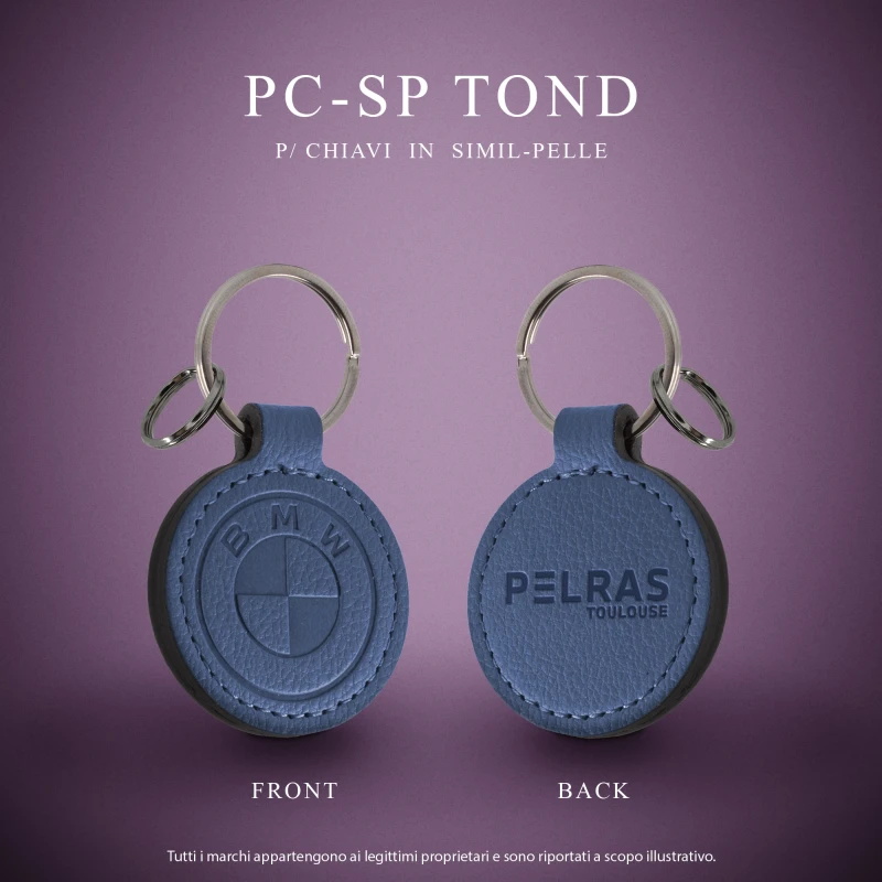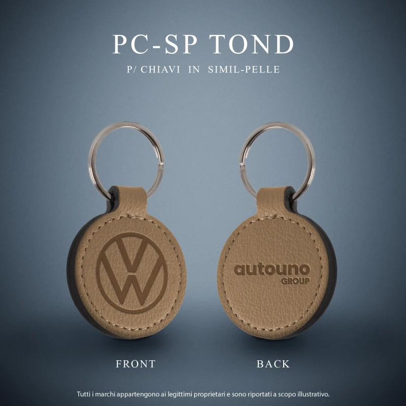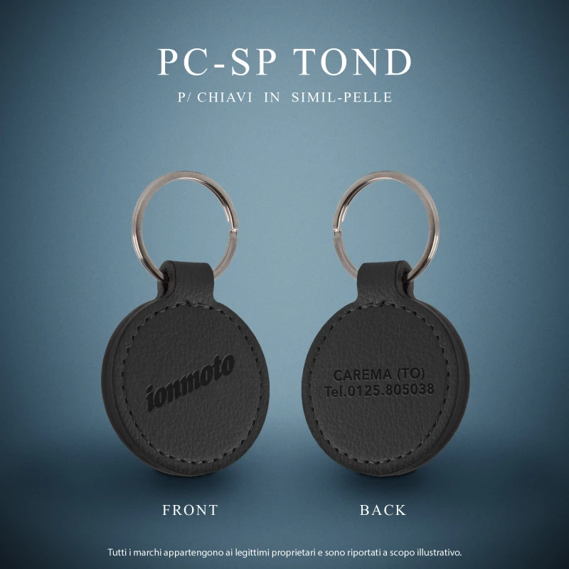 Schlüsselanhänger aus Kunstleder mit beidseitig personalisierbarem Druck. Erhältlich mit Band und/oder zusätzlichem Ring.