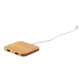 Wireless charger (5W) in bamboo housing with 2 USB charger ports. Max output 2100 mA. Including USB charger cable.