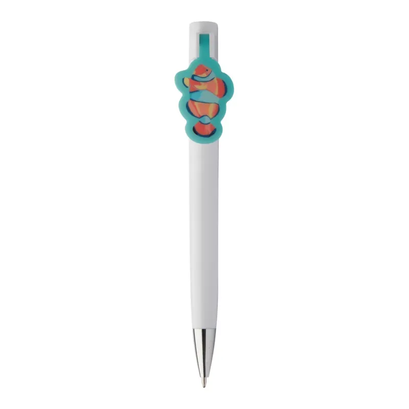 Plastic ballpoint pen with custom made clip and blue refill. The clip is made in custom shape - maximum size: 25×35 mm. Price includes UV LED printing on clip. MOQ: 100 pcs.