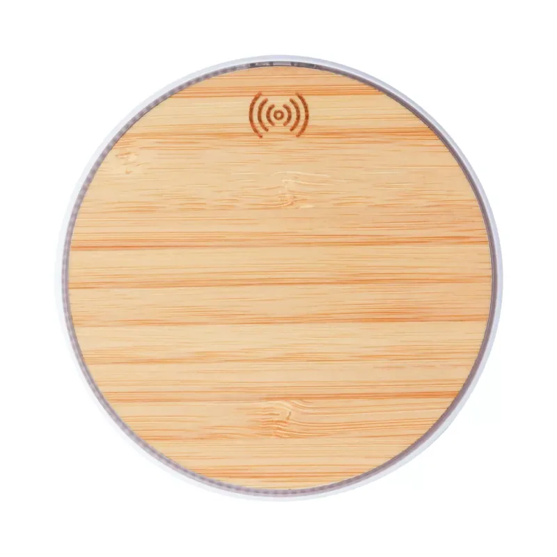 Wireless charger (10W) in bamboo and plastic housing. Including USB charger cable.