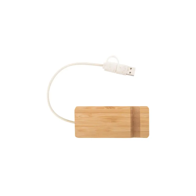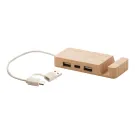 Bamboo USB hub with mobile holder function. With 2 USB and 1 USB-C ports, USB 2.0. Including cable with USB and USB-C connections.