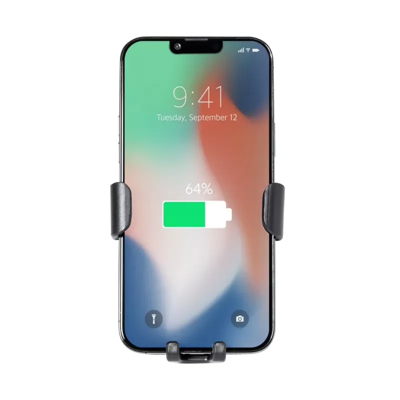 Car mobile holder in ABS plastic with built-in wireless fast charger (10W) and adjustable air vent mounting. Including USB charger cable.
