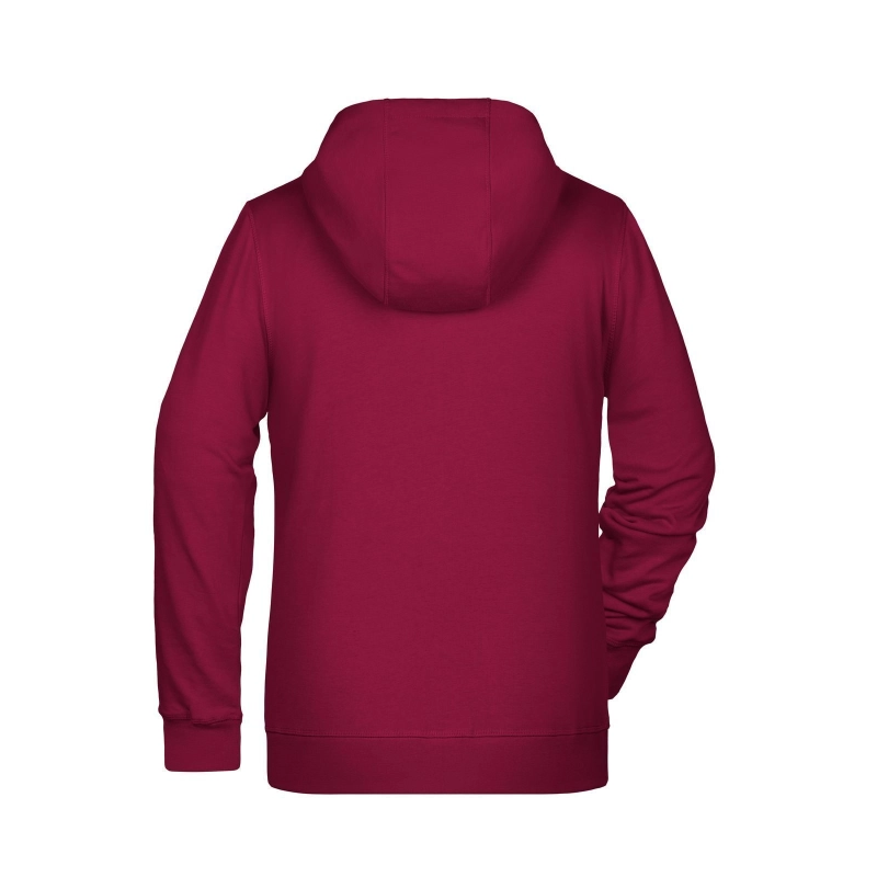 85% algodón orgánico hilado en anillo, 15% poliéster. S�ra para mujer en tejido de alta calidad, capucha de dos capas con cordón de ajuste, costuras divisorias laterales en la parte delantera, bolsillo de canguro, cierre completo con cremallera, etiqueta desgarrable, ligeramente aplanada.