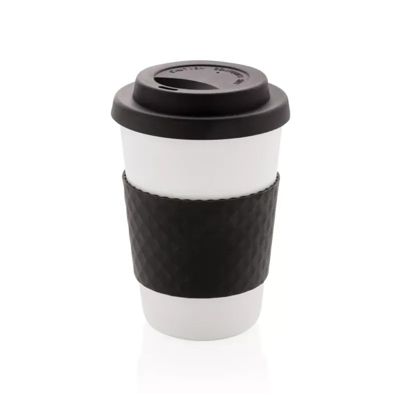 Mug 270ml en PP recyclable, couvercle et bandeau de protection en silicone. Convient pour les boissons froides et les boissons chaudes jusqu'à 100 degrés. Passe au lave-vaisselle et au micro-ondes.