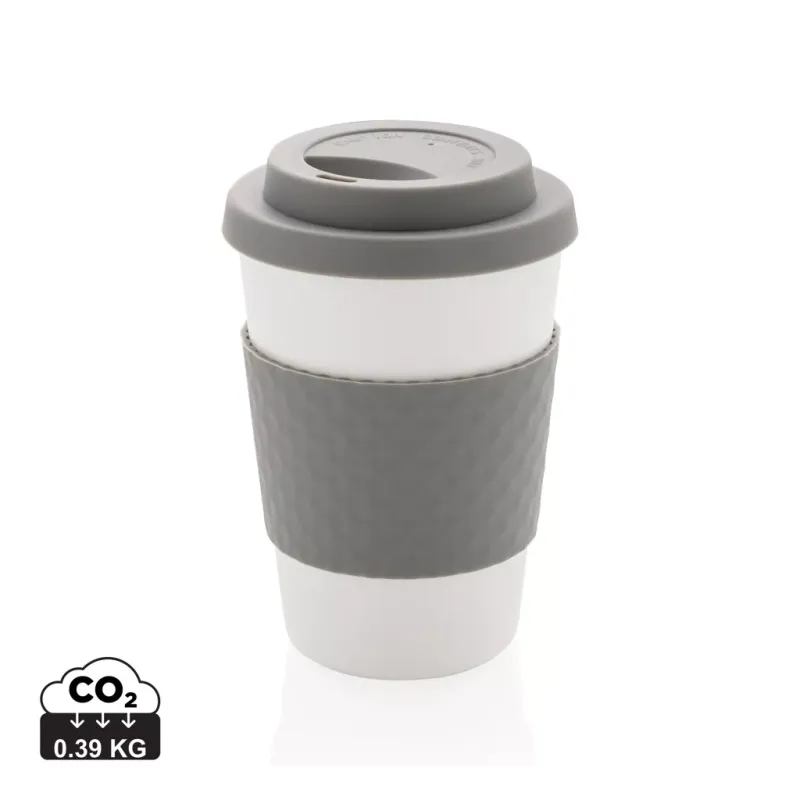 Mug 270ml en PP recyclable, couvercle et bandeau de protection en silicone. Convient pour les boissons froides et les boissons chaudes jusqu'à 100 degrés. Passe au lave-vaisselle et au micro-ondes.