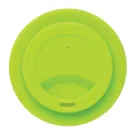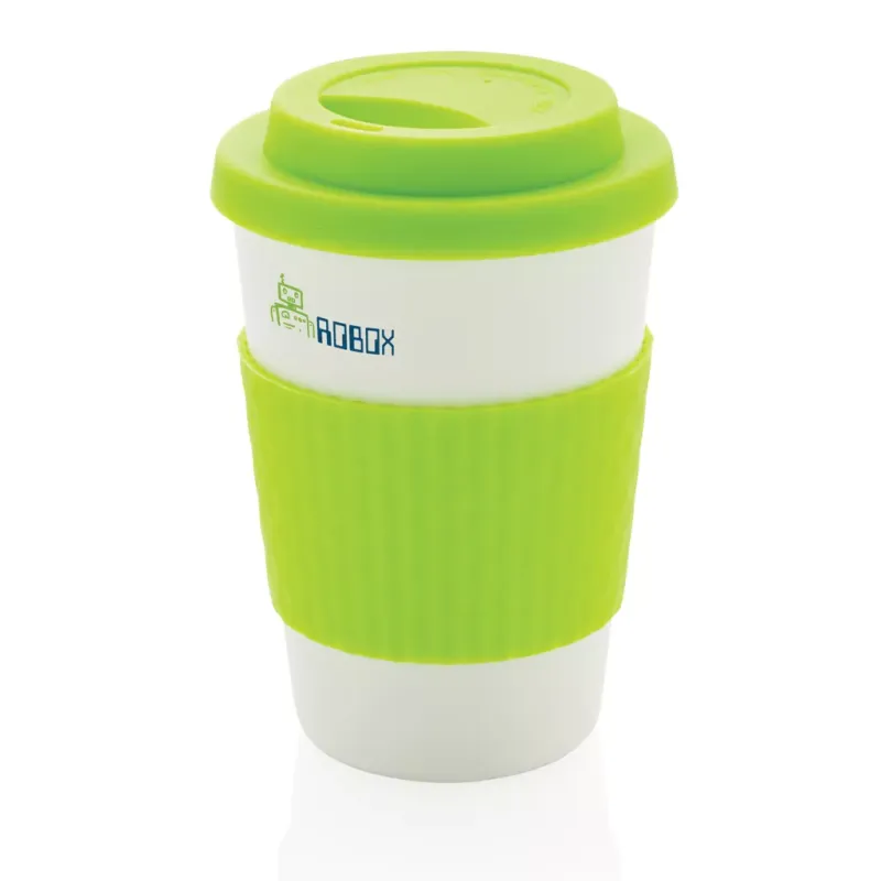 Mug 270ml en PP recyclable, couvercle et bandeau de protection en silicone. Convient pour les boissons froides et les boissons chaudes jusqu'à 100 degrés. Passe au lave-vaisselle et au micro-ondes.