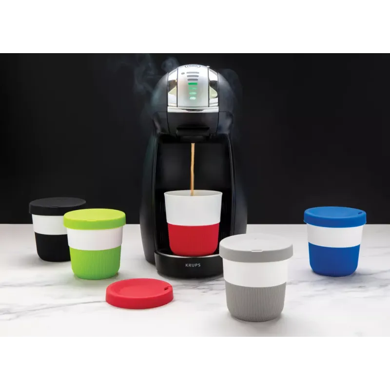 Mug 280ml avec partie blanche en PLA (100% de matériel végétal). Couvercle et bandeau de protection en silicone. Taille compacte idéale pour être placé sous la machine à café. 100% sans mélamine.