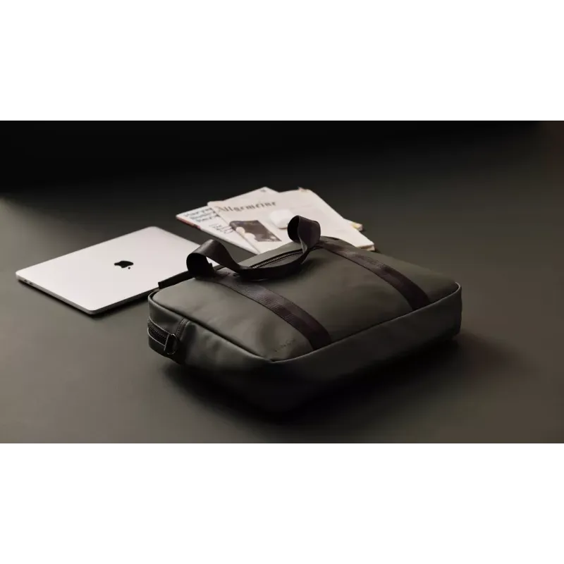 Sac d'ordinateur au design moderne et épuré. Les fonctions et la forme vont de pair. En plus de la poche ordinaire pour l'ordinateur, ce sac dispose également d'un emplacement pour les stylos, les documents et autres effets personnels. Le sac est fabriqué dans un matériau hydrofuge, avec une bandoulière et des poignées. Il comprend également une bande attachée à l'arrière, de sorte qu'il s'adapte à votre valise sur roulettes en voyage.