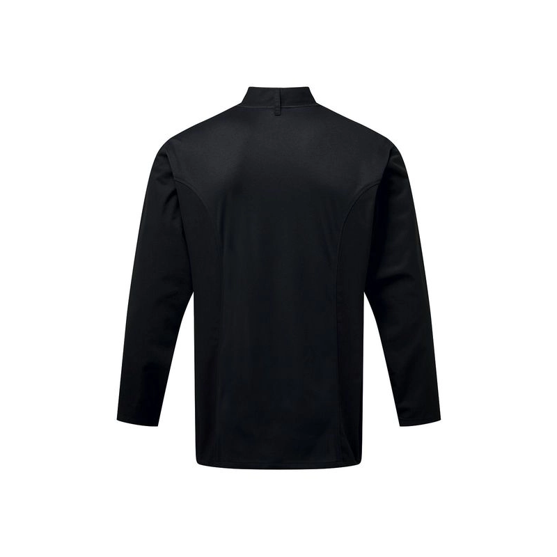 65% polyester, 35% coton twill. Veste de chef à manches longues. Dos Coolchecker®, poche stylo double, col mao, fermeture par boutons.