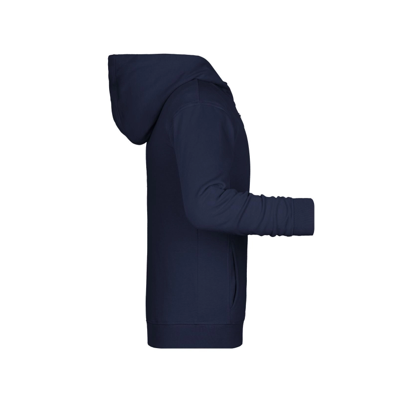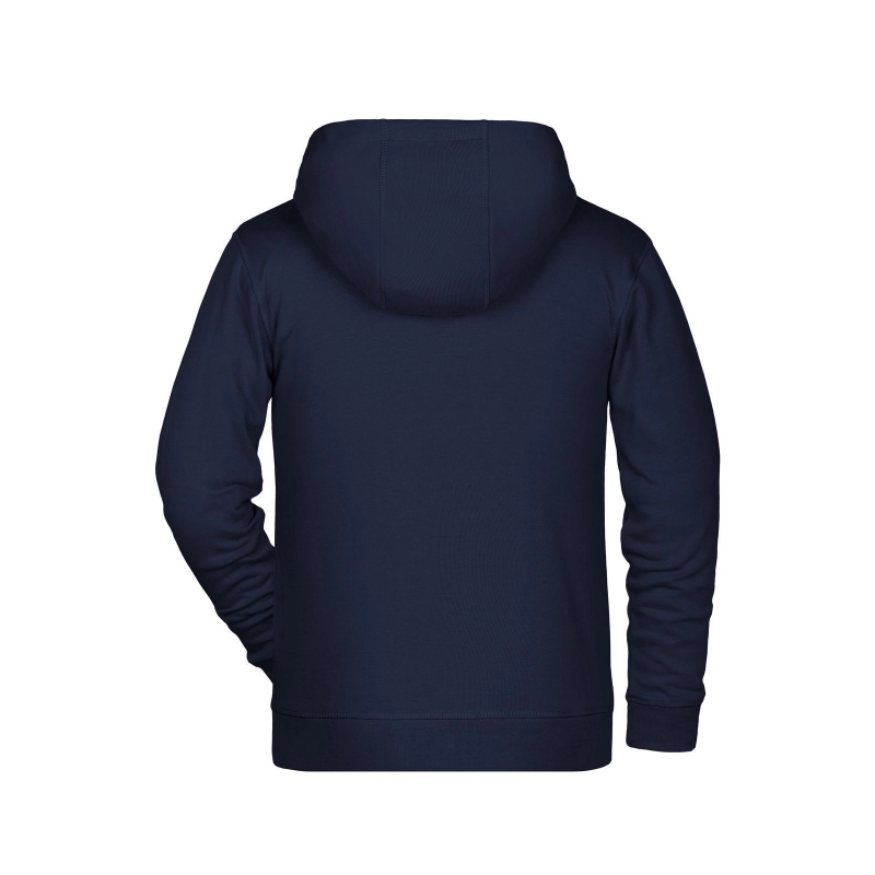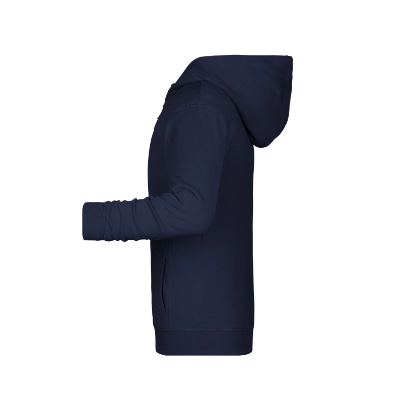 85% coton biologique peigné ring-spun, 15% polyester. French Terry de haute qualité, capuche double couche, coutures latérales à l'avant, poche kangourou, manchettes en élasthanne, zip YKK, étiquette Tear-Off.