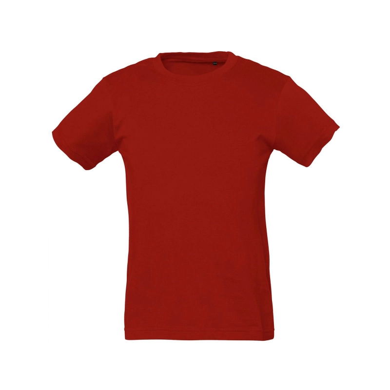 100% coton super peigné. T-shirt à encolure (double couche) en lycra pour enfant, bande d'épaule à épaule, étiquette détachable dans le col. Structure tubulaire.