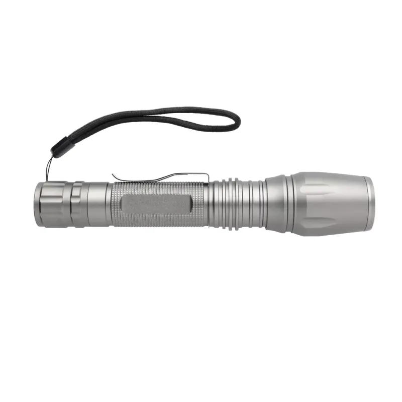 Lampe torche CREE 10 W en aluminium durable étanche (IPX 4), résiste aux chocs jusqu’à une hauteur de 1 mètre. Cette torche robuste et puissante est utile même dans les conditions les plus difficiles. Son faisceau peut être réglé pour viser ou éclairer une zone plus étendue. 250 lumens et autonomie de 6 heures. Clip ceinture et piles comprises pour utilisation immédiate.
