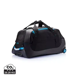 Borsone trolley in poliestere 300D RPET con 2 ruote, maniglia telescopica, chiusura a combinazione TSA ed etichetta RPET.