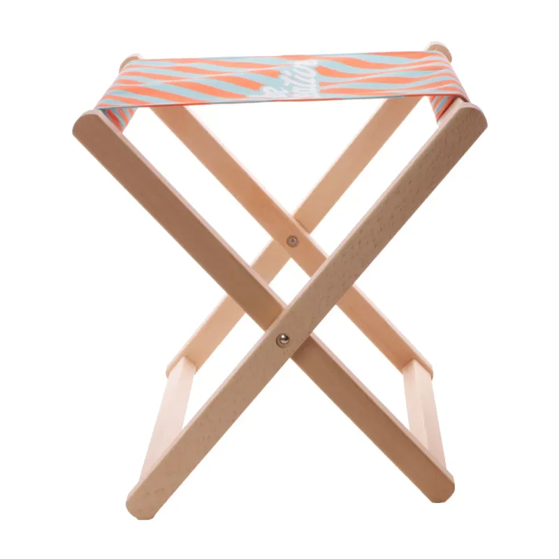 Sgabello da spiaggia in legno con tessuto in poliestere 600D RPET stampato in sublimazione. Il prezzo include la stampa in sublimazione. Limite di peso: 100 kg. MOQ: 10 pezzi.
