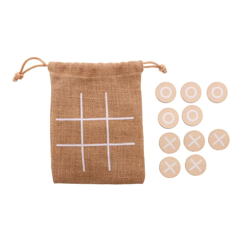 Gioco del tris personalizzabile in compensato di betulla con 10 pedine e sacchetto in juta. Il costo è comprensivo di una identica stampa a colori sul retro di tutte le pedine. MOQ: 100 pezzi.