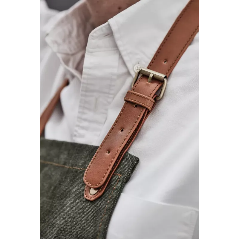 Resistente grembiule in tela stonewashed 500 gm2 con dettagli in PU. Un grembiule che invecchia con dignità.