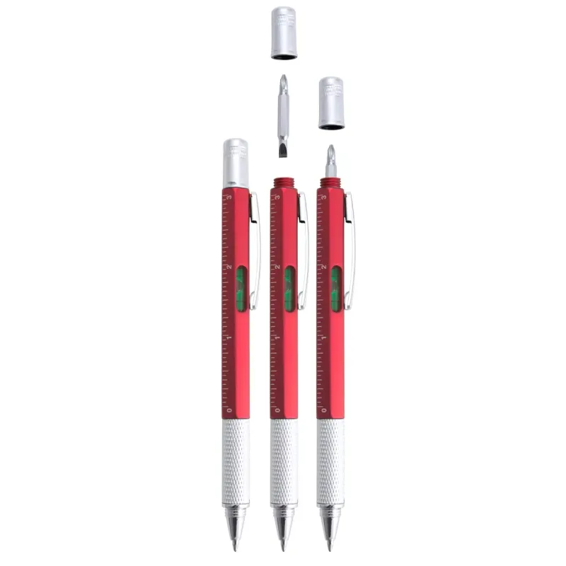 Penna a sfera in plastica con cacciavite piatto ed a stella, livella a bolla e righello da 7cm / 3 pollici. Con clip in metallo e refill blu.
