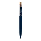 Penna a sfera in alluminio riciclato con refill blu, finitura gommata, pulsante in bambù e clip cromata. Con rivestimento speciale per incisione laser a specchio.