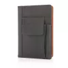 Copertina rivestita in PU con tasca frontale porta smartphone (10x14), taschino porta penna e tasca principale porta powerbank. Separatore di pagina di colore nero, 160 pagine da 80 g/m2. La copertina è riutilizzabile con un nuovo taccuino A5.