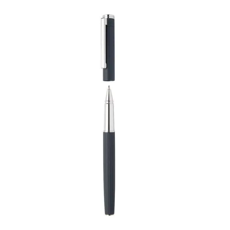 Elegante set composto da una penna a sfera ed una roller con fusto in alluminio testurizzato a righe, in confezione regalo nera e refill blu.
